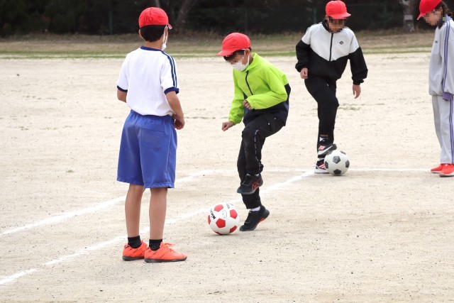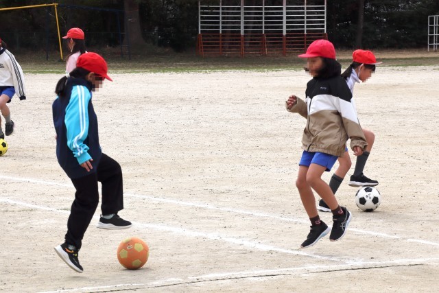 4年赤組は体育の学習です。サッカーの練習をします。