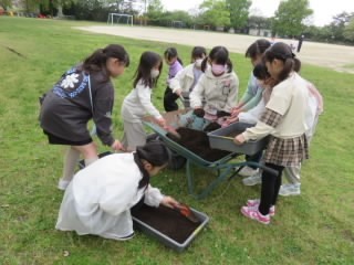 「季節によって植物の様子はどのように変化するのか」をテーマに、植物の成長の過程を観察します。今日はヘチマの種をビニルポットに巻きます。