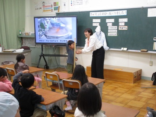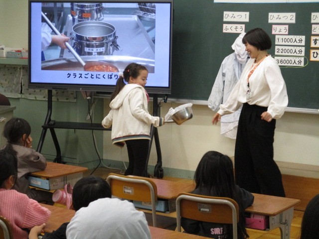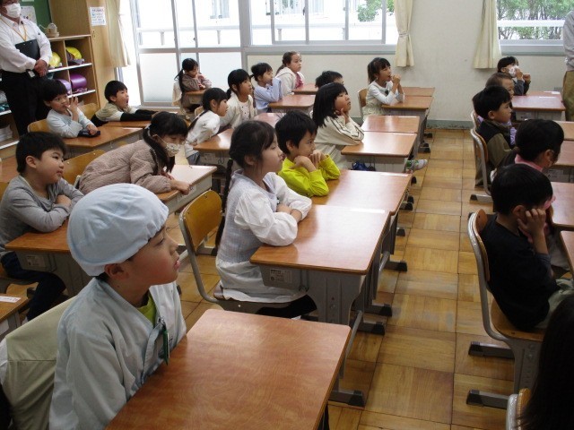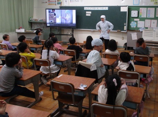 給食ができるまでの様子を動画で観て、給食のひみつについて考えました。