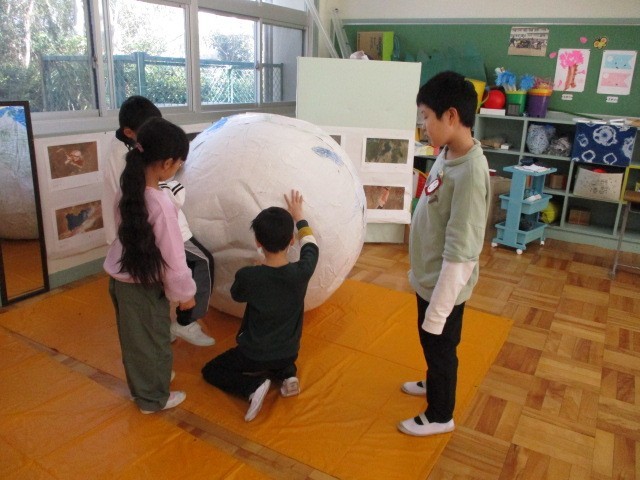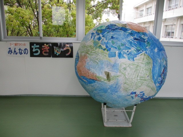 3学期に作っていた巨大な地球のオブジェが、今週からは2階東渡りに置いてあります。