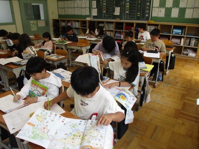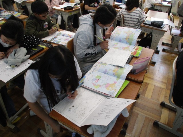 大陸や海の名前、おもな国の名前などを地図帳を使って調べていました。世界地図にもこれから慣れ親しんでいきます。