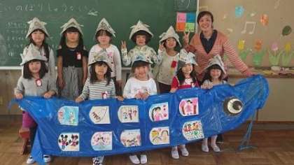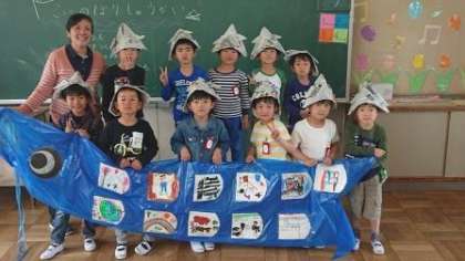 新聞紙を折ってかぶとを作り、絵本を読んでもらったり歌を歌ったりしました。