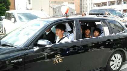 タクシーで、出発