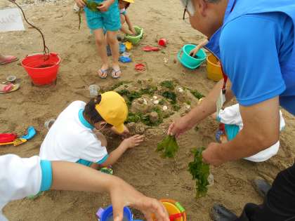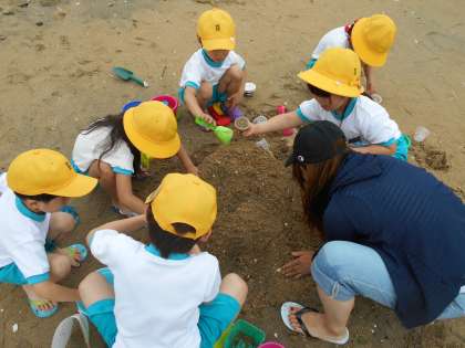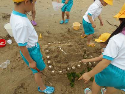 大野海岸で砂のお城を作ってきました。どの班も貝殻やわかめを使って飾ったり、土台を高くしたりするなど工夫してそれぞれのお城を作っていました。ボランティアで参加してくださった保護者のみなさま、ありがとうございました。