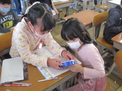 4月20日(水) 2年 算数 公開日 2022/04/20 更新日 2022/04/20 大野小の部屋 2年生は、算数で「時刻を調べよう」の単元を学習していました。一人一台の簡易時計を持ち、ペアになって問題に取り組みました。お互いに協力し合って教え合う姿はとても立派でした。 いいね(0)