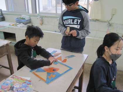 5の1は、図工で電動のこぎりを使ってパズルのピースをつくったり、下絵に丁寧に色を塗ったりしていました。どの作品もアイデアに富んでいて素敵なものばかりです。