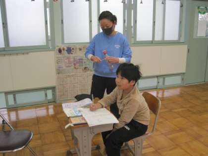 3組では、算数の学習をしたり、音楽の教科書を読んだりしていました。