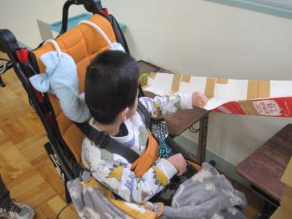 6組では、牛乳パックにボールを転がして、缶の中に入れる作業を行っていました。いろいろな大きさや、手触りの違うボールに触れて入れていました。