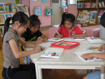 大放課には、図書委員会による「キャラクターぬり絵」「表紙絵パズル」「本さがしゲーム」を楽しみました。また、参加賞の「しおり」をもらって嬉しそうでした。「ブックリくらぶ」さんによる読み聞かせも大人気でした。