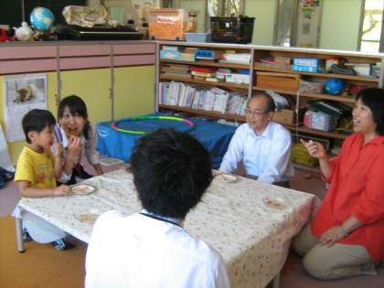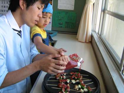「収穫祭」やりました 公開日 2010/06/29 更新日 2010/06/29 3・4・5・6・7組の部屋 教育実習の先生2人と、畑で採れた野菜を使って「収穫祭」をしました。メニューは、実習の先生方が考えてくれた「なすとピーマンとウインナーの串焼き」です。買い物も調理も実習の先生も一緒にしました。 なすが大好きな校長先生と養護教諭の先生にも来ていただいてみんなで楽しくいただきました。 いいね(0)