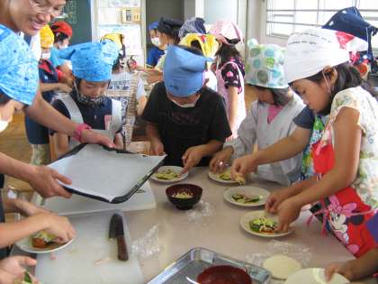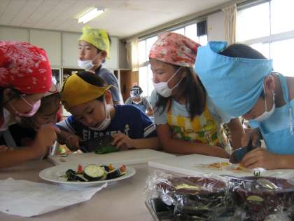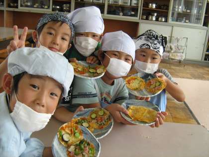 7/15 野菜パーティー 公開日 2010/07/20 更新日 2010/07/16 2年生の部屋 中庭で育てた野菜を使って、ピザを作りました。包丁で野菜をきるときも、慎重に上手に切ることができました。そして、でき上がった野菜たっぷりのピザをみんなおいしそうに食べていました。みんなで作ったピザは、一段とおいしく感じられたのではないでしょうか。 いいね(0)