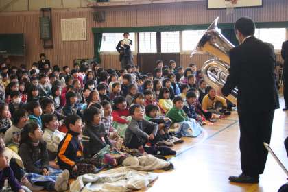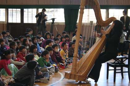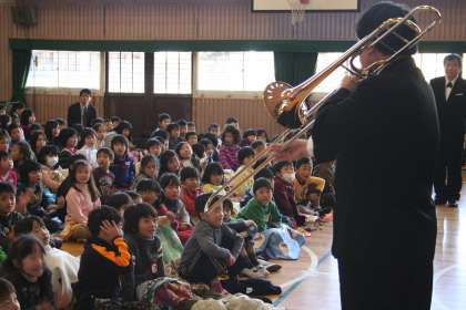 公演の中で、たくさんの楽器を紹介していただきました。それぞれの楽器の音色に合わせて子どもがよく知っているテーマ曲を奏でていただき、子どもたちも楽しいひとときをすごすことができました。