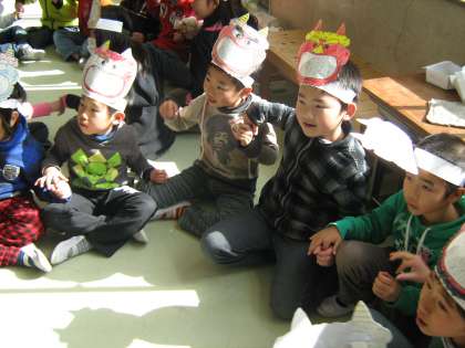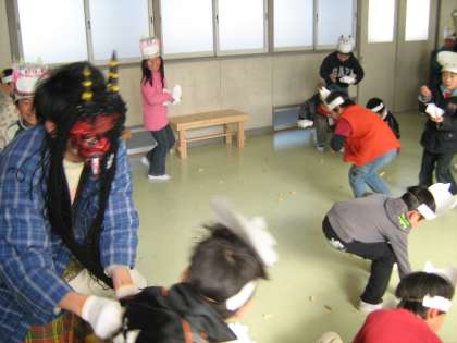 2年生で豆まき集会をしました。節分の始まりについて、絵本の読み聞かせを聞いた後は、楽しいゲームを行いました。そして、いよいよ豆まきです。自分たちの追い出したい「心の鬼」に豆をぶつけた後は、本当の鬼の登場です。突然の鬼の登場に驚いている子もいましたが、思いっきり豆を投げて、2年生全員の「心の鬼」を外に追い出すことができたと思います。