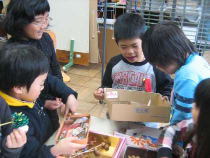 生活科の授業では、2年生のどんぐりのお店に招待してもらい、どんぐりごまやどんぐりボーリング、どんぐりめいろなど、いろいろな遊びを楽しみました。また、まつぼっくりに絵の具で飾り付けをして、かわいいツリーも作りました。2年生がたくさん準備をしてくれたおかげで、楽しい時間を過ごすことができました。2年生、ありがとう★