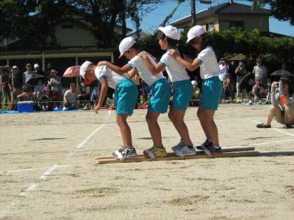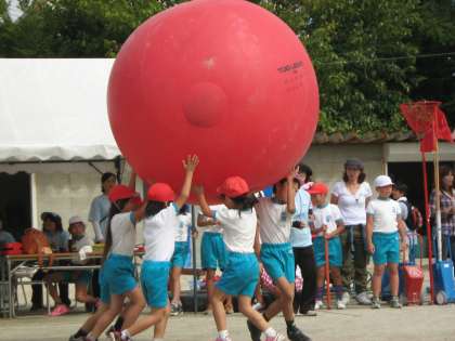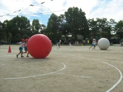 10月2日運動会が行われました。学年競技は大玉転がしです。まずは、2人で大玉を転がします。自分の背丈よりも高い大玉を転がすのは至難の業です。次に5人で大玉を持ち上げ運びます。少しの差で、白が勝ちました。3,4年生合同競技は、ムカデ競争です。4人が息を合わせて前へ前へと進みました。