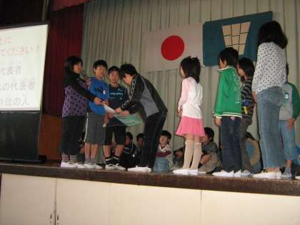 11月1日(木)には,スマイルタイムで図書委員会が,本をたくさん読んだ児童の表彰と,本に関する楽しいクイズを出してくれました。推薦図書をこれまでに20冊全部読んだ6名の児童は推薦図書読破賞をもらいました。続いて多読賞の個人の部と学級の部の表彰がありました。また,各学年の推薦図書より三択クイズを出していました。
