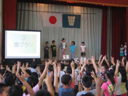 6月12日(木)のスマイルタイムに,保健委員会の発表がありました。始めにむし歯の原因や予防についての劇がありました。劇の後半では,「むし歯にならないために歯磨きをしましょう」と保健委員の児童が呼びかけ,全校で指切りをしました。一週間取り組んだ「歯磨き調べ」の結果や「むし歯の治療が必要な児童」の人数報告の後,歯に関するクイズで盛り上がりました。毎日の歯磨きをていねいに行い,自分の大切な歯を守ってほしいです。