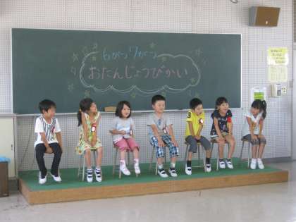 6、7月の誕生日会 公開日 2014/07/16 更新日 2014/07/16 1年生の部屋 7月15日に6、7月の誕生日会をしました。この日の主役は7人です。7才になって頑張りたいことを発表したり、ハンカチ落としをやったり、とても楽しい時間になりました。お誕生日おめでとう♪ いいね(0)