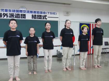 7月12日(日)には,常滑市全体の海外派遣団結団式がありました。7月17日(木)には,メキシコ派遣団壮行会が行われました。派遣団のメンバー紹介やメキシコの国の紹介後,児童が現地で見せるカルチャーショーの披露がありました。練習を重ねた「さるかに合戦」の英語劇や,「八木節」の合奏,「ソーラン節」の踊りなど,どれもすばらしい演技でした。