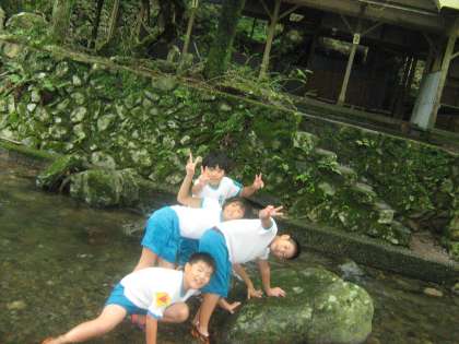 1日目,大野小学校を出発し,くらがり渓谷に向かいました。くらがり渓谷では,ハイキングと川遊びを行いました。冷たい水に歓声があがっていました。工夫してダムを造ったり,葉っぱで舟を流したりしていました。