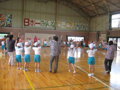 25日(木)の朝に全校で「みんなで踊ろう」の練習会を行いました。地域の方にお手本を見せていただき,一緒に踊りました。引き続き,1年生は1時間目も教わりました。横について,丁寧に教えていただいたおかげで,最後にはとても上手に踊れるようになりました。本番が楽しみです。