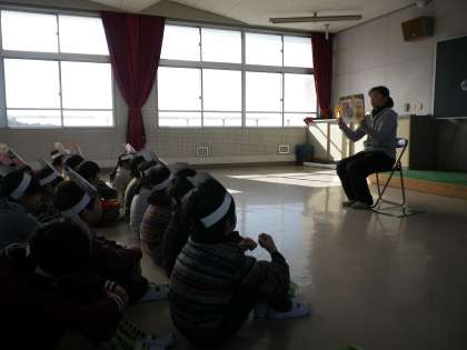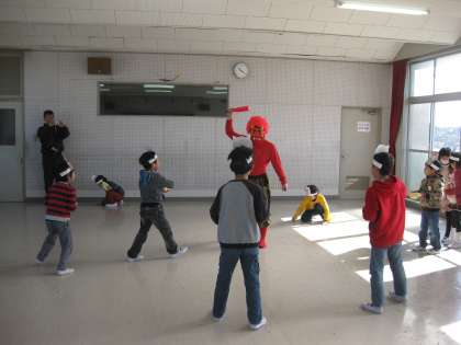 2月3日(火)の2時間目に、一年生で豆まき集会をしました。節分の意味について話を聞き、紙芝居のあと、みんなで豆まきをして心の中の鬼を退治しました。鬼の登場に子どもたちは、びっくりしていました。