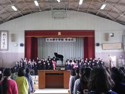 卒業式・お別れ式 公開日 2015/03/23 更新日 2015/03/23 大野小の部屋 3月20日(金)に卒業式がありました。一人一人が真剣に行った卒業証書授与,気持ちを込めた在校生・卒業生の呼びかけの言葉と歌,子どもたちは練習の成果を発揮し,立派な式となりました。保護者や卒業生の中には,涙する姿もありました。 1年生から3年生は,卒業式前に行う「お別れ式」に参加しました。感謝の言葉を伝えたり,歌を一生懸命に歌ったりしました。6年生からも歌やお礼の言葉があり,心温まる会となりました。 いいね(0)