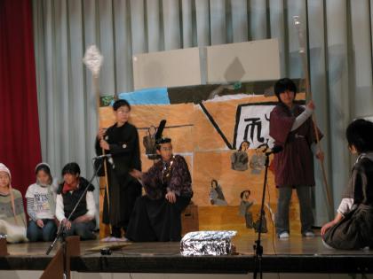 劇の台本は、社会や国語、音楽の授業で学んだことを活かして、自分たちの手で作り上げました。そして必要な大道具・小道具も自分たちの手で作り、すべてオリジナルで仕上げました。