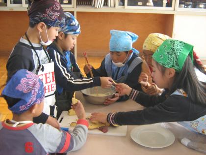 11月21日 さつまいも収穫祭 公開日 2007/11/29 更新日 2007/11/21 4年生の部屋 畑でとれたさつまいもで天ぷらを作りました。厚さも大きさもまちまちでしたが、揚げたての天ぷらはとてもおいしく、たくさん食べました。また、残りのいもはくじ引きで分けて、持ち帰りました。 2年生にできることはやらせてあげたり、難しいことは教えてあげたりと、頼もしい姿が見られました。 いいね(0)