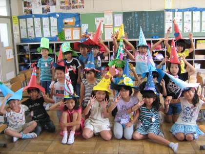自分だけの、オリジナルな帽子を作りました。画用紙で形を作り、持って来た材料で飾り付けをしました。イメージ通りに作ることの難しさに気付き、一人一人が工夫をして帽子を作り上げていきました。完成した帽子をかぶっての記念撮影では、満足した笑顔をたくさん見ることができました。