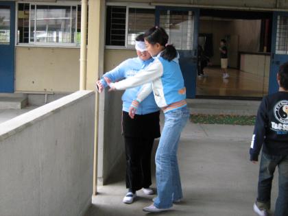 1回目の福祉実践教室では、ガイドヘルプと車いすの体験をしました。