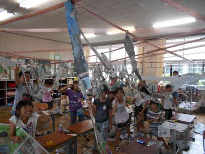 新聞紙を細かく切り、どんどんつないでいく活動をしました。初めは一人で活動をしていた子も、イメージを膨らませながら活動をしていく中で、他の子と自分の作品をつないだり、協力して一つの作品を作ったりするようになりました。お互いに声をかけ合い、楽しみながら作品作りをすることができた授業でした。