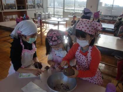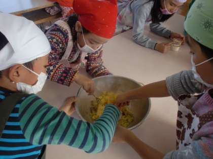 おいもパーティー 公開日 2015/12/21 更新日 2015/12/21 2年生の部屋 収穫したサツマイモを使って、スイートポテト作りをしました。イモを洗って皮をむくところから子どもたちの手で行いました。お店で売っているものとは違い、一つ一つの形が非常に特徴的でしたが、楽しみながら協力して調理をすることができました。完成したスイートポテトは、2年生みんなでおいしくいただくことができました。 いいね(0)