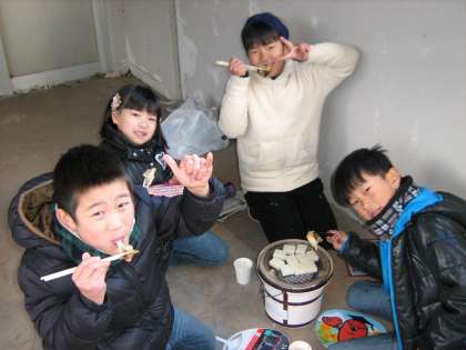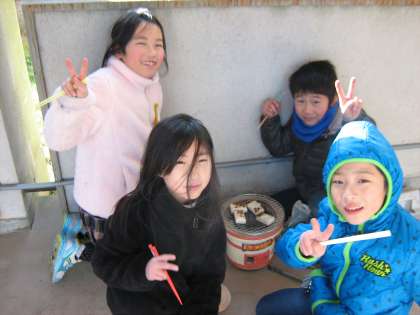社会科「昔の人びとのくらし」の学習で、七輪体験を行いました。グループみんなで協力し、木炭に火をつけることができました。寒い中、苦労して焼いたおもちは、とてもおいしかったですね。