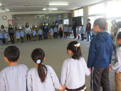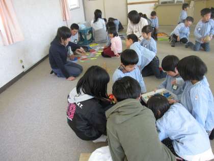 青海子ども園では,6年生が園児の子を楽しませようと考えたおもちゃで遊んだり,本を読んであげたりしていました。また,最後には全員で「世界がひとつになるまでに」を歌い,温かい会になりました。
