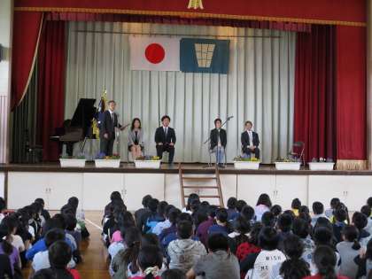4月15日(金),離任式がありました。今年度は,4名の先生方が転出されました。先生方に子どもたちから,お礼の手紙と花束が渡されました。「先生のおかげで,できなかった問題が解けるようになりました。」「先生は太陽のような人でした。先生が担任でよかったです。」「一緒に遊んでくれてありがとう。」「先生との思い出を忘れません。」と気持ちを込めて書いた手紙を発表しました。その後,先生方お一人お一人から,言葉をいただきました。「たくさんの思い出をありがとう。」「後悔しないようにがんばってください。」「達成感を味わえるように努力のつぼに水をためてください。」「たくさん食べて心も体も大きくなってください。」とたくさんのメッセージをいただきました。「大野小でみなさんと過ごせてとても幸せでした。ありがとうございました。」と感謝の言葉もありました。教室でのお別れ会も企画され,涙のお別れ式となりました。