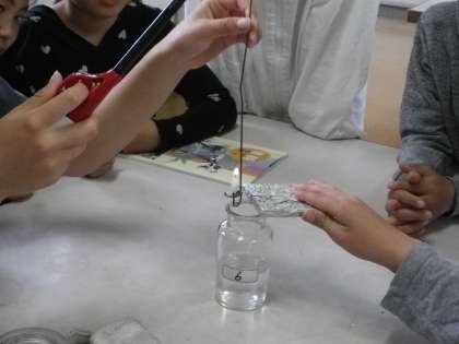 理科の学習では、「ものの燃え方と空気」の学習をしています。どの気体が燃えるはたらきがあるのか、予想を立てて実験を行いました。予想と比べながら子どもたちは、「やっぱり!」「違った。」と声を出しながら、学習を進めていました。
