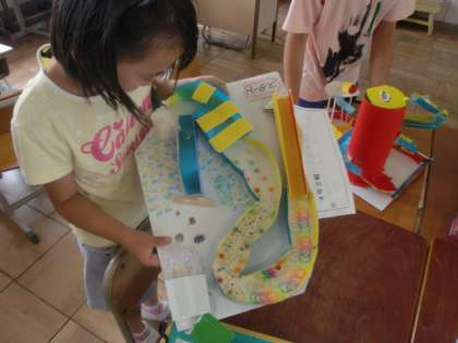 図工「コロコロガーレ」 公開日 2016/06/10 更新日 2016/06/10 4年生の部屋 ビー玉を転がして遊ぶ迷路を作りました。ビー玉が転がり落ちる仕組みについて考え、試行錯誤を繰り返しながら作品を作ることができました。作品の完成後、友だちと作品を交換して遊び、それぞれの作品の良さを認め合う事が出来ました。 いいね(0)