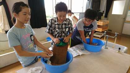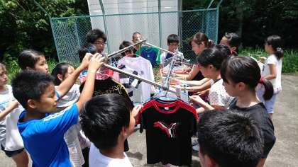 家庭科の学習で、手洗いで洗濯をしました。もみ洗い、つまみ洗いをして、汚れを落とした後、ねじりしぼり、すすぎをして、きれいに手洗いをしました。干すときには、しわをのばしたり、形をととのえたりして工夫をしていました。乾いた衣服をみた子どもたちはとても満足した様子で、どの子も笑顔でした。