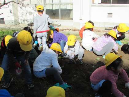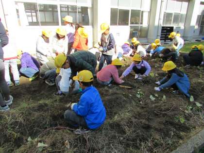 今日、2年生が生活科の授業で1学期に植えたサツマイモのイモ掘りを行いました。夏にうっそうと茂っていた葉や茎を取り除き、土を掘ると、大きなサツマイモがたくさん出てきました。みんなうれしそうでした。