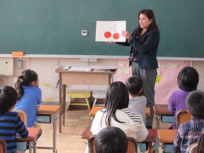 2年1組の外国語活動の様子です。パネルに描かれた果物を英語で答える学習です。とても楽しく取り組めました。