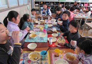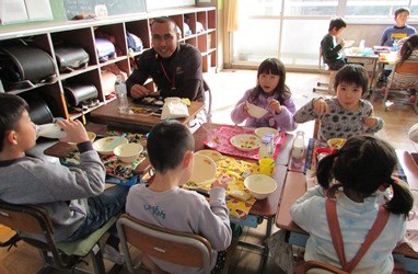 2年1組の子どもたちがセクション7小学校のハフィス先生や子どもたちといっしょに給食を食べました。