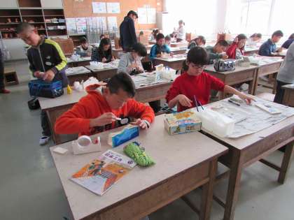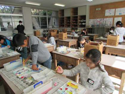 6年生が図工の時間にテープカッターを作りました。自分の好きな図柄を絵の具で彩色し、一人一人が自分のオリジナルのテープカッターを作りました。