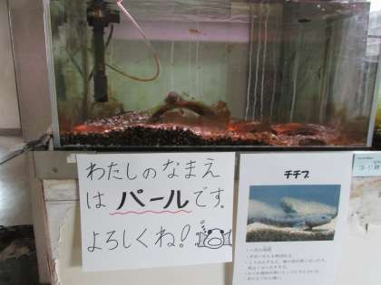 大野小学校の水族館には、鯉や金魚の他、カメやアカハライモリ、ドジョウ、フナ、モツゴ、メダカ等、たくさんの生き物がいますが、一番人気はハゼの仲間のチチブです。先日、子どもたちの投票で名前が「パール」に決まりました。興味のある方は、ぜひ見に来てください。ちなみにこの魚は、今年の春、教頭先生が矢田川で釣ったものです。毎日、ミミズを食べてずいぶん大きくなりました。