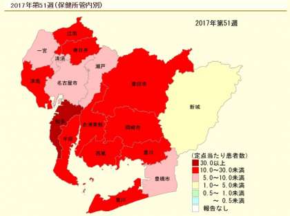 この調査結果によりますと、平成29年第51週(12月18日(月曜日)から12月24日(日曜日)まで)におけるインフルエンザ患者の定点医療機関当たりの報告数)が、国立感染症研究所が定める警報の指標である「30」を上回る地域があったことから、インフルエンザ警報を発令されました。
