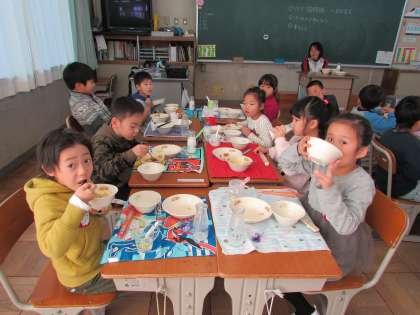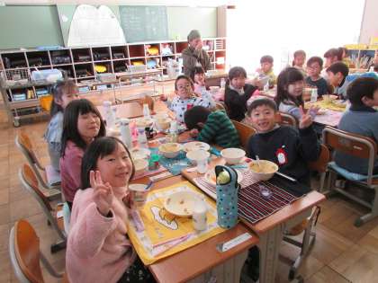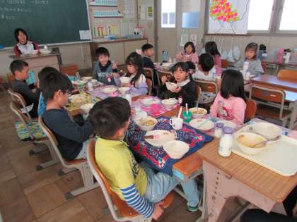 1年1組の給食の様子です。給食の準備も、食べることも、後片付けも速くなりました。