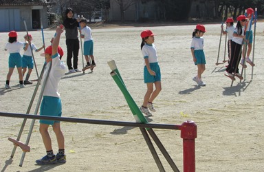 1年1組の体育の授業の様子です。運動場を走って体が温まったので、今度は竹馬に挑戦です。