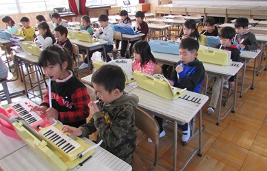1年1組の音楽の授業の様子です。鍵盤ハーモニカの練習をしていました。