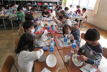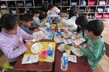 3/9 2年 非常食喫食体験1 公開日 2018/03/09 更新日 2018/03/09 2年生の部屋 2年1組の非常食喫食体験の様子です。非常食米の袋の底を広げ、注水線まで水を注ぎます。スプーンでひとまぜし、チャックを閉めて、1時間待ちました。 いいね(0)