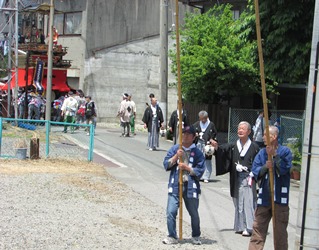 大野橋の西の方から、主催者に先導されて山車が見えてきました。